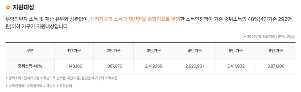 기준 중위소득 47% 이하 가구만 신청 가능합니다. 1인 가구는 월소득 1,038,946원, 4인 가구는 2,462,909원 이하여야 해요.