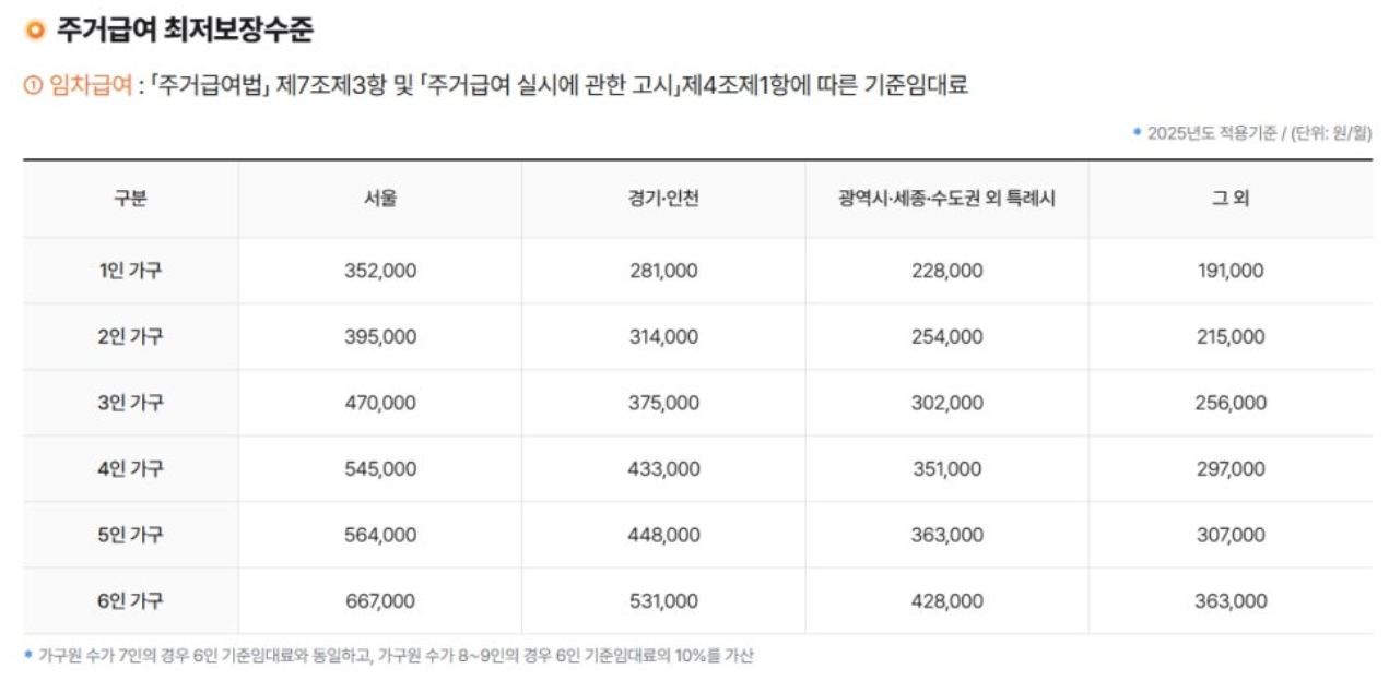 주거급여는 지역별, 가구원수별로 지급액이 다릅니다. 서울 4인 가구 기준 월 최대 624,000원 (최저 545,000원)까지 받을 수 있고, 실제 임대료가 기준액보다 낮으면 실제 임대료만큼만 지급됩니다. (서울 1인가구 최저 352,000원) 월세뿐만 아니라 관리비 중 공용관리비도 포함되니 계약서 확인 시 이 부분도 챙기세요.